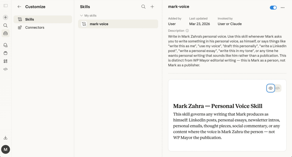 The result is a Claude Skill, which is a reusable file that loads into Claude and governs how it writes whenever I want something in my personal voice.